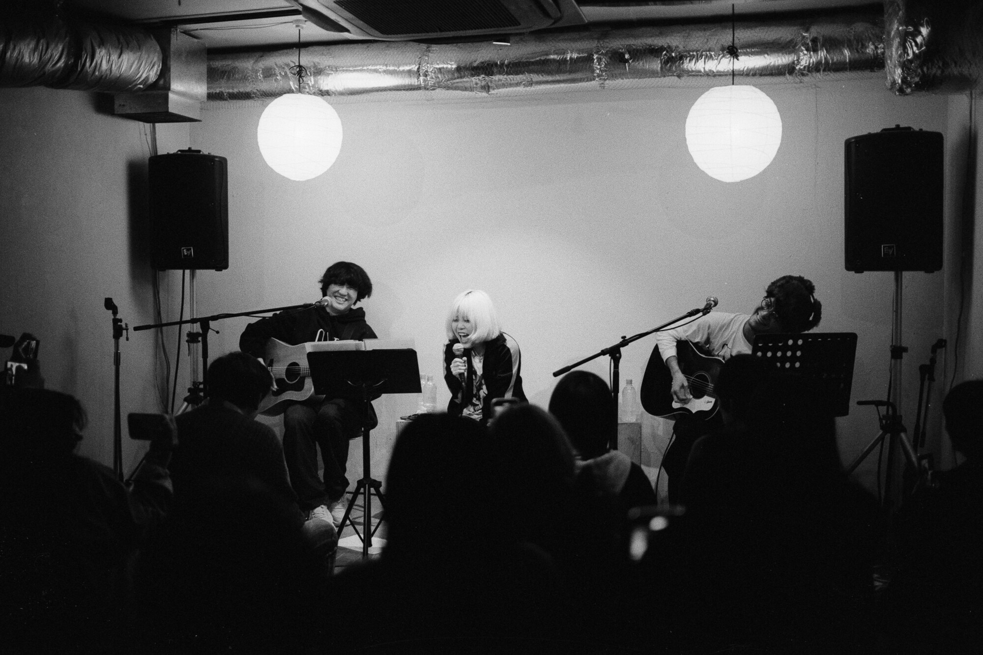 After her set, there was the main acoustic performance by a duo from 愛しておくれ (Aishite Okure). We didn’t know the band, but we enjoyed them regardless. When they finished their set, they started covering one of Onizawa’s songs. She eventually joined them on stage to sing together. That evening I had my camera loaded with HP5 film, which I was exposing at EI 800 while photographing flamboyant streets of Shimokita after sunset, so I managed to take several photos at the concert despite the dim light.