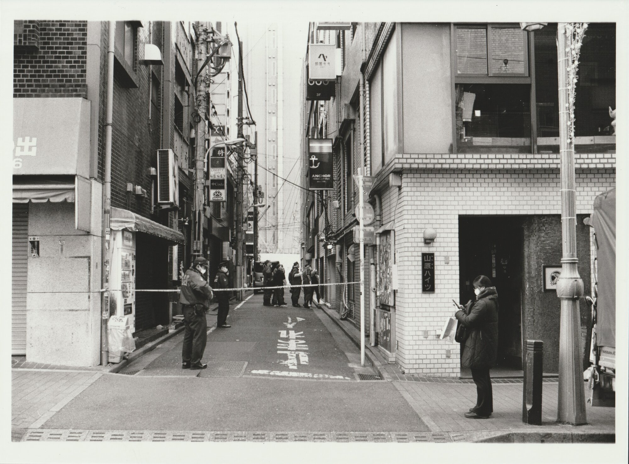 Here is a print I made with a single exposure. When photographing this scene, I exposed for the shadows in the alley. It was sunset, so the sun was only hitting the building at the end of the alley. When doing a test strip, I tried to gauge the exposure for the area where my subject, the policeman on the left, stands. After fixing the print and turning on the lights, I was disappointed by the lack of detail on the far away building. It’s almost invisible. Additionally, some areas on the buildings in the foreground looked slightly brighter than I wanted. I gave it another try, but this time I used the burning tool. I have marked the areas here that received extra exposure. The arrows show direction of the burning tool’s movement. It’s unrelated, but the negative’s placement in the carrier is slightly shifted as well.